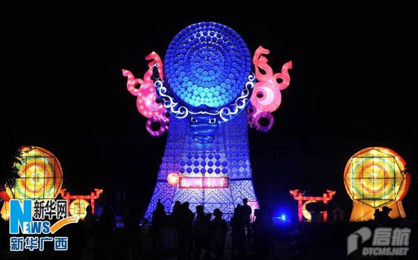 9月22日晚,游人在观看一组壮乡铜鼓造型的彩灯。