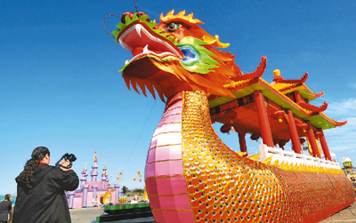 11月10日,在美国加州圣克拉拉大美国游乐园展出的“天下第一灯嘉年华”自贡灯会举办媒体预展。据悉,这将是中国自贡彩灯首次走进美国。图为记者在拍摄龙舟彩灯。