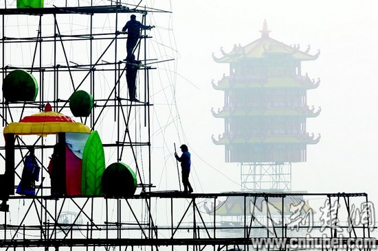 湖北日报讯 昨日,东湖上工人们正在湖面搭建花灯,远处的黄鹤楼造型花灯已经基本完成。本月底,具有1800年历史的熊猫灯会即将在东湖掀开神秘面纱,与市民见面。(记者刘曙松摄)