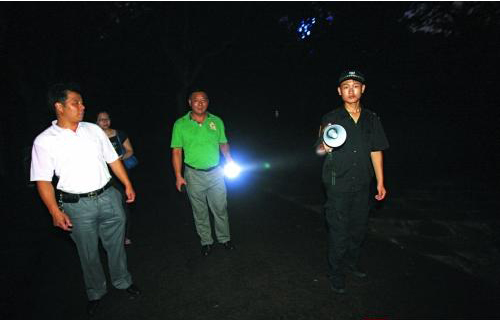 夜晚10点左右,记者跟随公园保安开始夜间第3次巡园。刚走出不到100米,就发现了一对躺在凳椅上的年轻情侣。“几点了?还在这里,很不安全的,快走吧!”在送走这对隐蔽在树荫下的情侣,保安颇感无奈地告诉记者:“真的就像玩捉迷藏一样,公园里没灯,树又密,只要有心往树丛里一钻,真的很难发现。所以,我们一个晚上要巡夜五六次,差不多50分钟一圈,总能抓到几个漏网之鱼。”